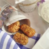 Cubrimos la croqueta de queso con el sésamo y la ponemos a freír en el aceite. Cuando estén doraditas las sacamos y las ponemos a escurrir sobre papel de cocina.