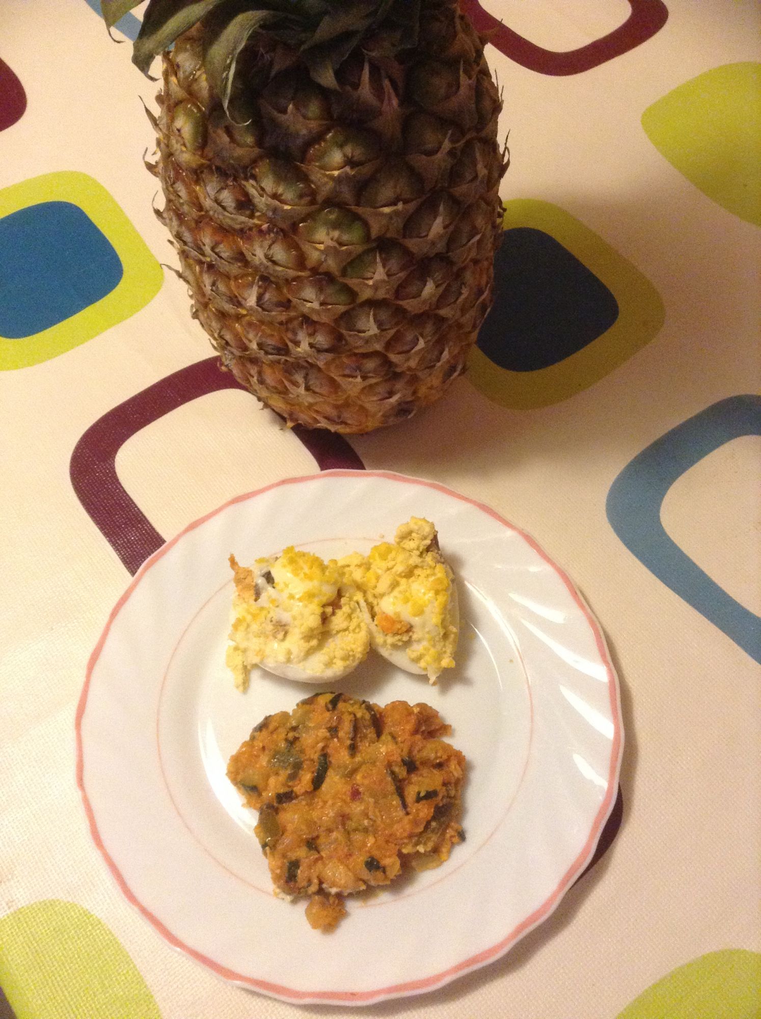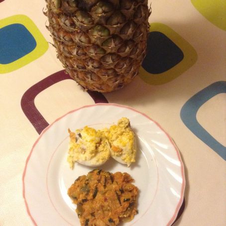Huevos cocidos, duros, partidos por la mitad y rellenos de piña, atún, tomate la clara del huevo, acompañados con pisto de calabacín, cebolla, pimiento rojo y verde con aceite de oliva.