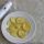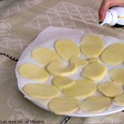 Cortar las patatas en lonchas finitas y colocar en un plato sobre papel de horno.