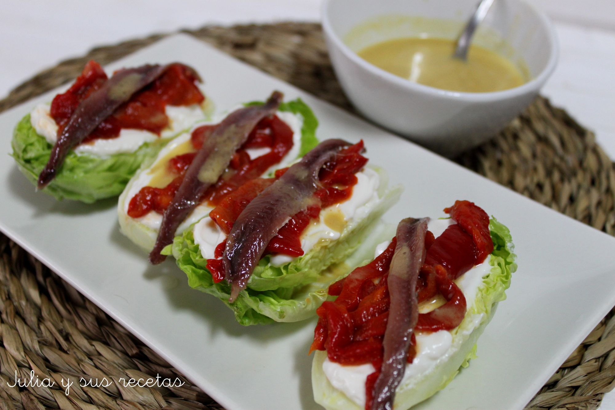 Los ponemos en una fuente y les ponemos una poquita mayonesa encima, los pimientos encima de la mayonesa y un filete de anchoa para terminar.