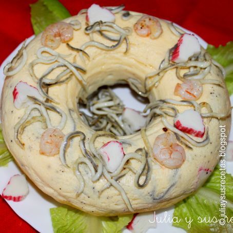 Lo dejamos enfriar y lo adornamos con las gambas y las gulas que hemos reservado saltadas con ajo en polvo.