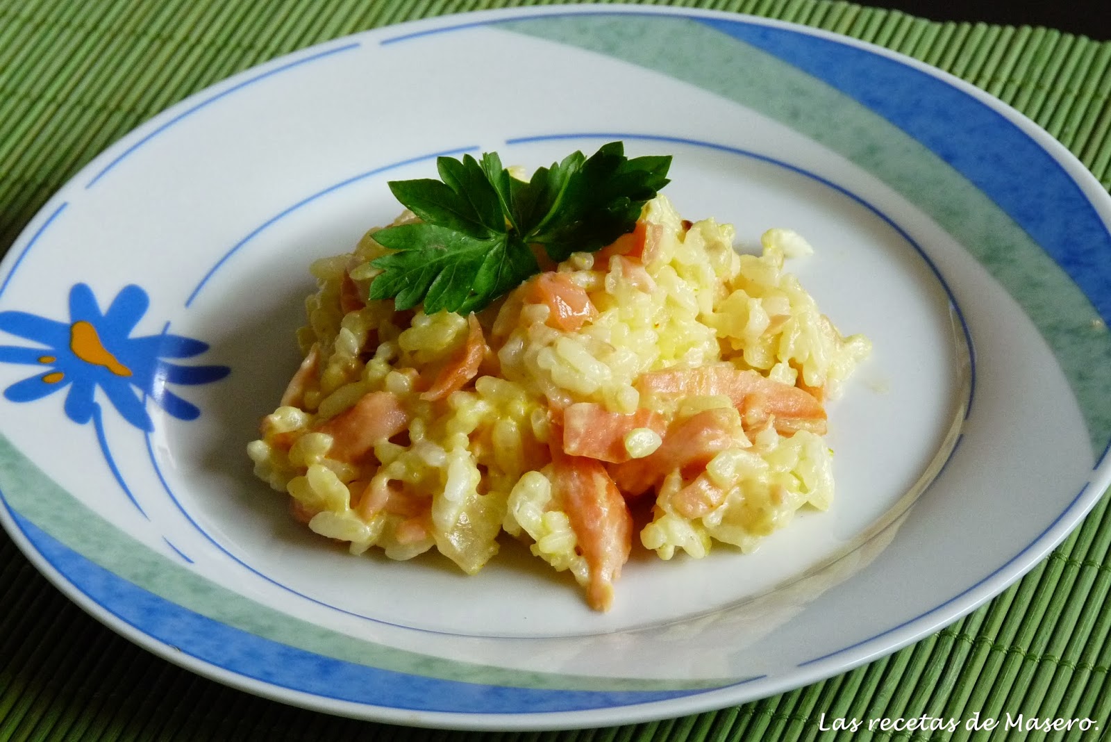 Me gusta el arroz en todas sus variedades. Es tan versátil que se puede combinar con muchísimos ingredientes y elaborar miles de recetas distintas, dulces o saladas...Mi favorita con diferencia es la paella de marisco, me encanta y sobre todo la de mi madre. Aún soy un poco inexperta para meterme en esos menesteres, así que de momento haré platos más sencillos con arroz, como el que hoy os traigo, se trata de arroz con salmón ahumado. Se tarda un periquete y está muy rico. La hice en la chef o matic pro, pero también os pongo como se hace de manera tradicional. Las cantidades son para dos personas.