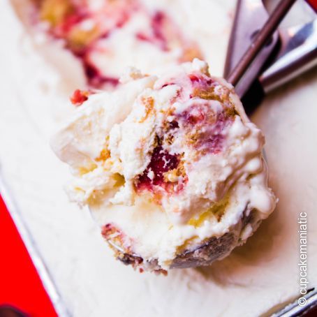 Para el montajes del helado, cogemos un molde, y ponemos una capa de nata, una capa de frutos rojos, y la mitad de las galletas. Removemos con un palillo de brocheta para crear un poco el efecto "swirl", para que se mezcle todo un poco. Continuamos con otra capa de nada, frutos rojos, galletas. Así hasta acabar. Ser generosos con la nata. Aproximadamente poner en cada capa 1/3.