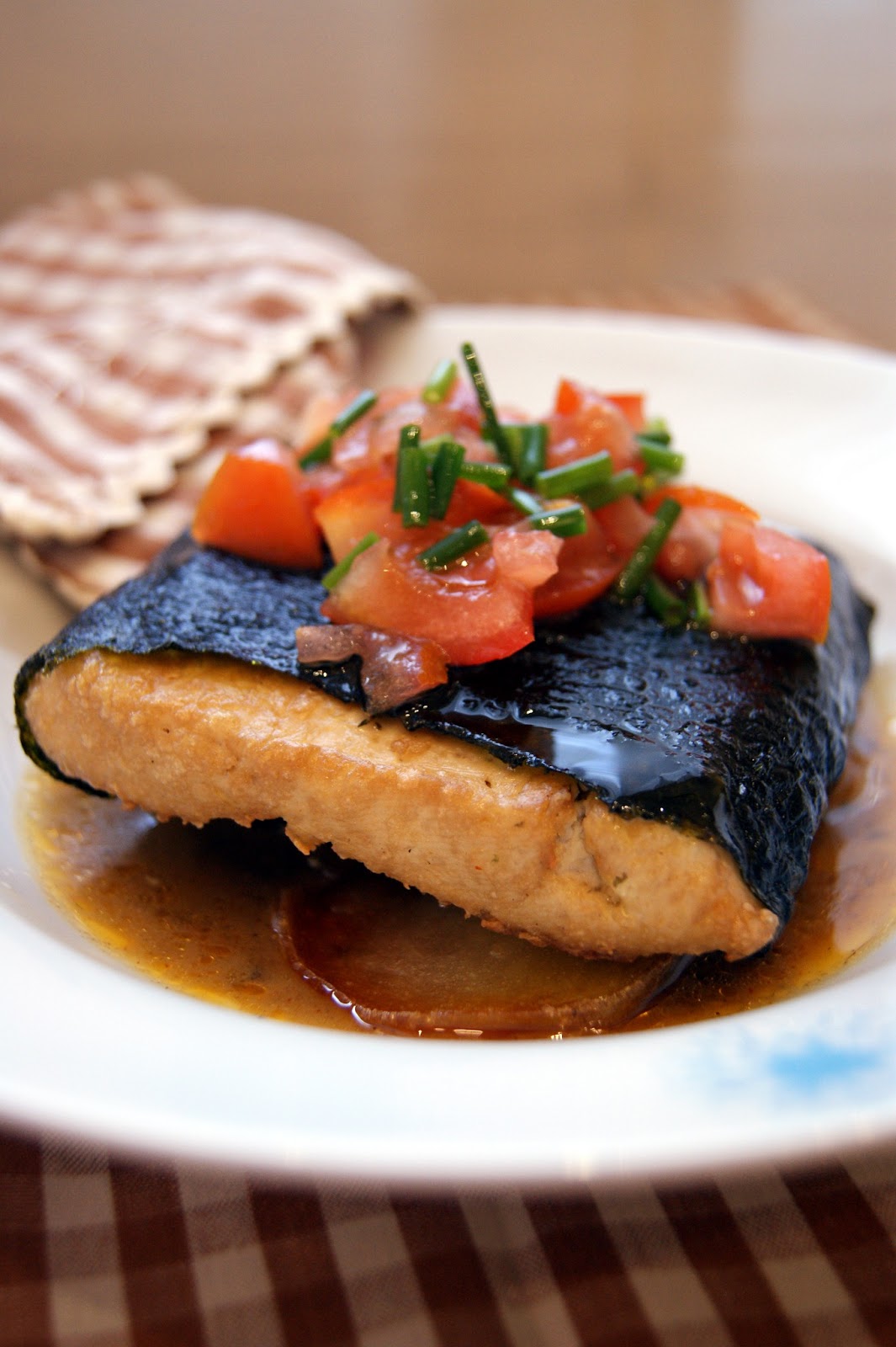 Con el tofu y la algas se pueden conseguir sabores y texturas increíbles. No es una receta complicada. Tan solo lleva su tiempo por la maceración del tofu en el jugo marino (algas). Lo demás es muy fácil y rápido. Podéis poner más cantidad de tartar de tomate, yo he puesto aquí menos para la presentación de la foto. El sabor fresco del cebollino y el limón quedan perfectos con el sabor a mar de las algas. En lugar de patatas confitadas, podéis poner cualquier otro tipo de verdura, a vuestra elección.