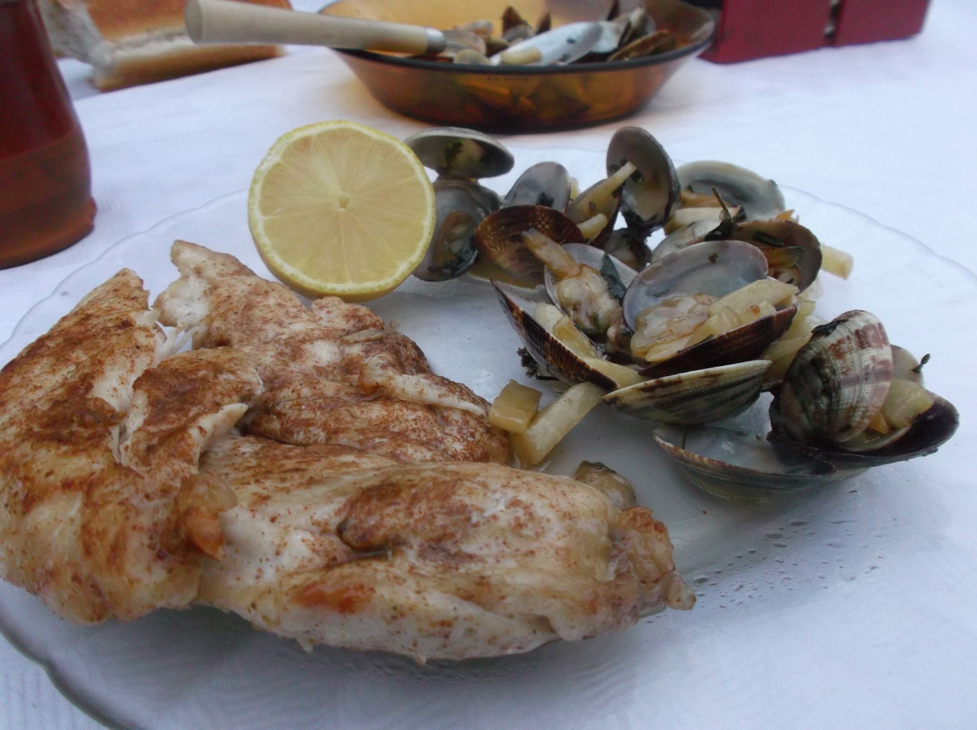 Se coloca un filete de pechuga en cada plato, repartiendo las almejas entre ambos platos.