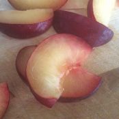 Cortamos las ciruelas a la mitad despojándonos del hueso, cortamos cada mitad en gajos.