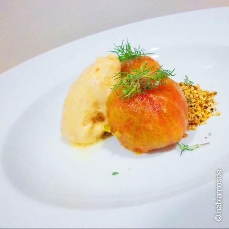 Esfera de tomate relleno de ahumados y encurtidos, sorbete de agua de tomate nitro y tierra de almendras