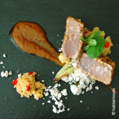 Untar las supremas de bonito por ambas caras con las semillas de sésamo.