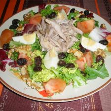 Ensalada templada de frijoles, champiñón francés, pulpa de kumato y codorniz confitada a la emulsión de Jerez con especias
