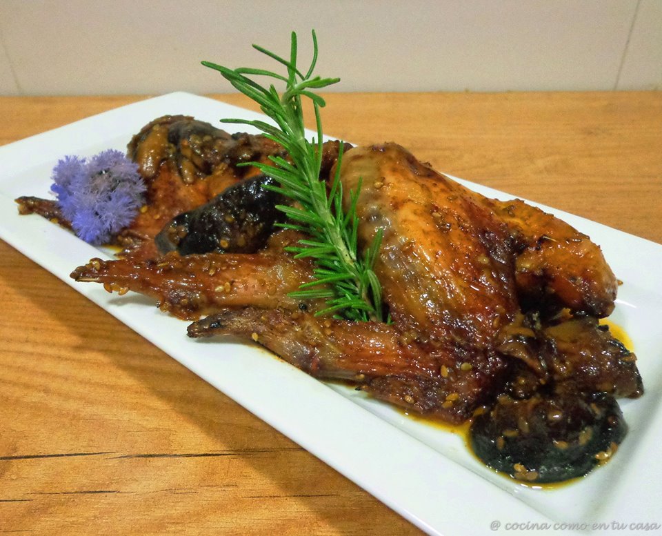1. Poner tres alas por cada comensal, napar con el jugo de cocción y acompañar de las setas.