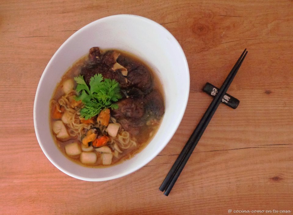 Ramen de mejillones, carne de zamburiña y setas sitake