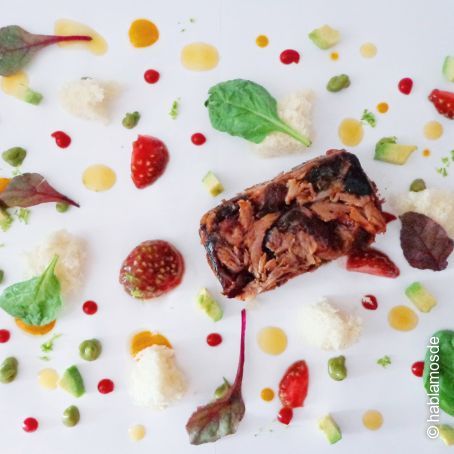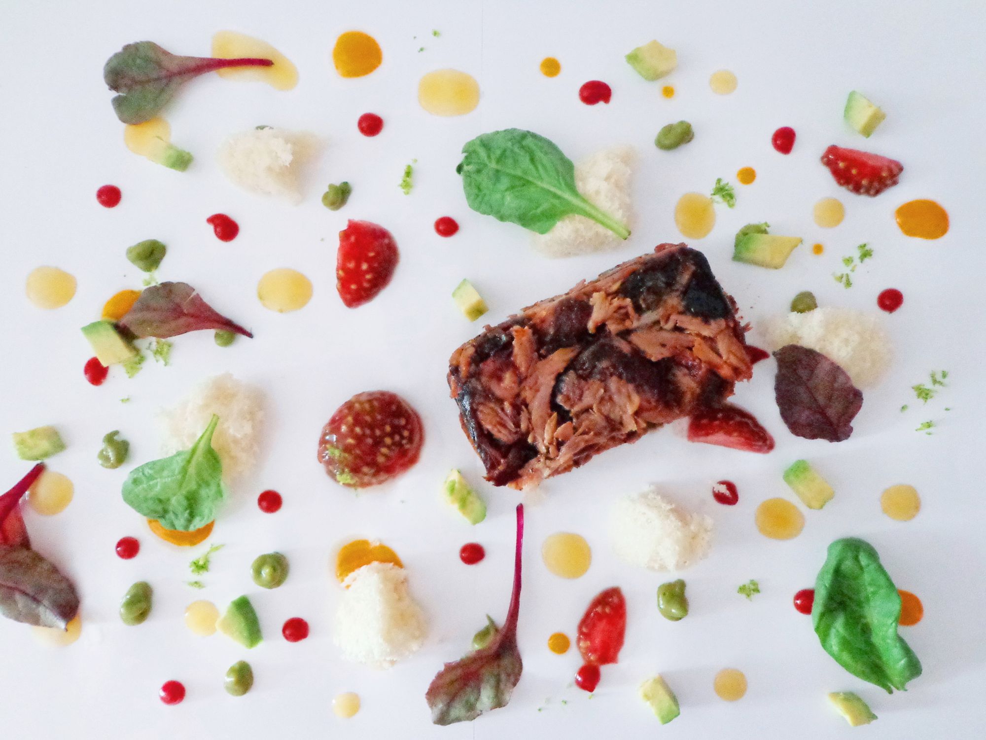 Kebab de lechón ahumado a baja temperatura, aguacate, miga aérea de trigo, kumato y brotes tiernos