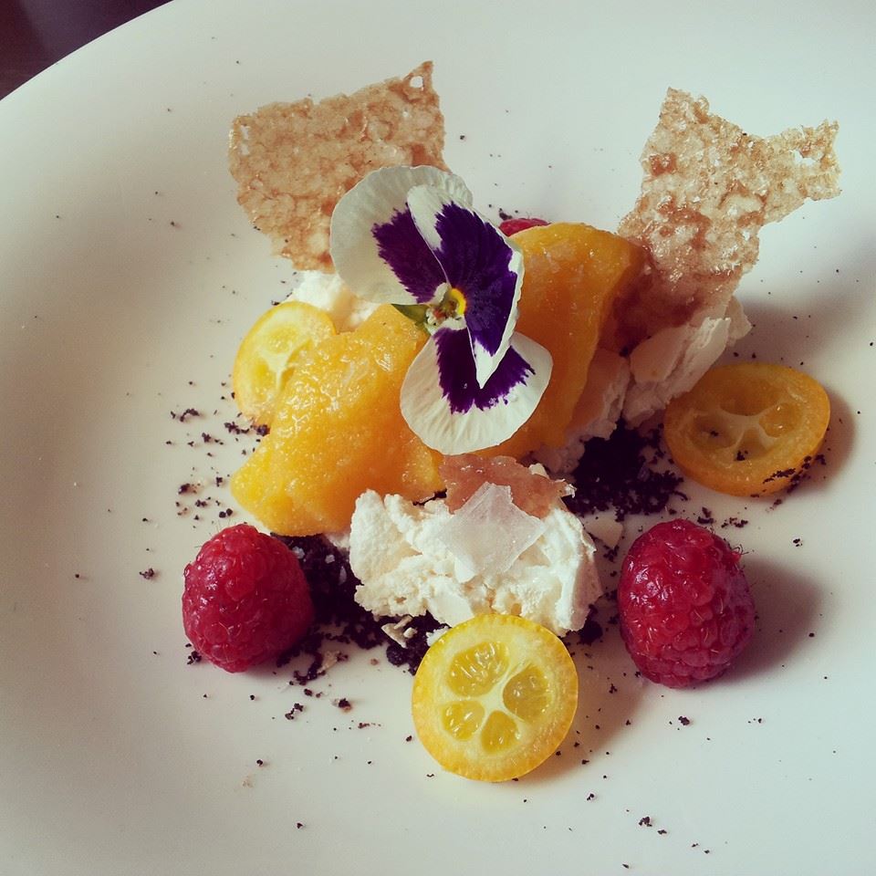 Sorbete de melocotón al vino blanco, rocas de merengue sobre tierra de oreo con tips de naranja y kumbat