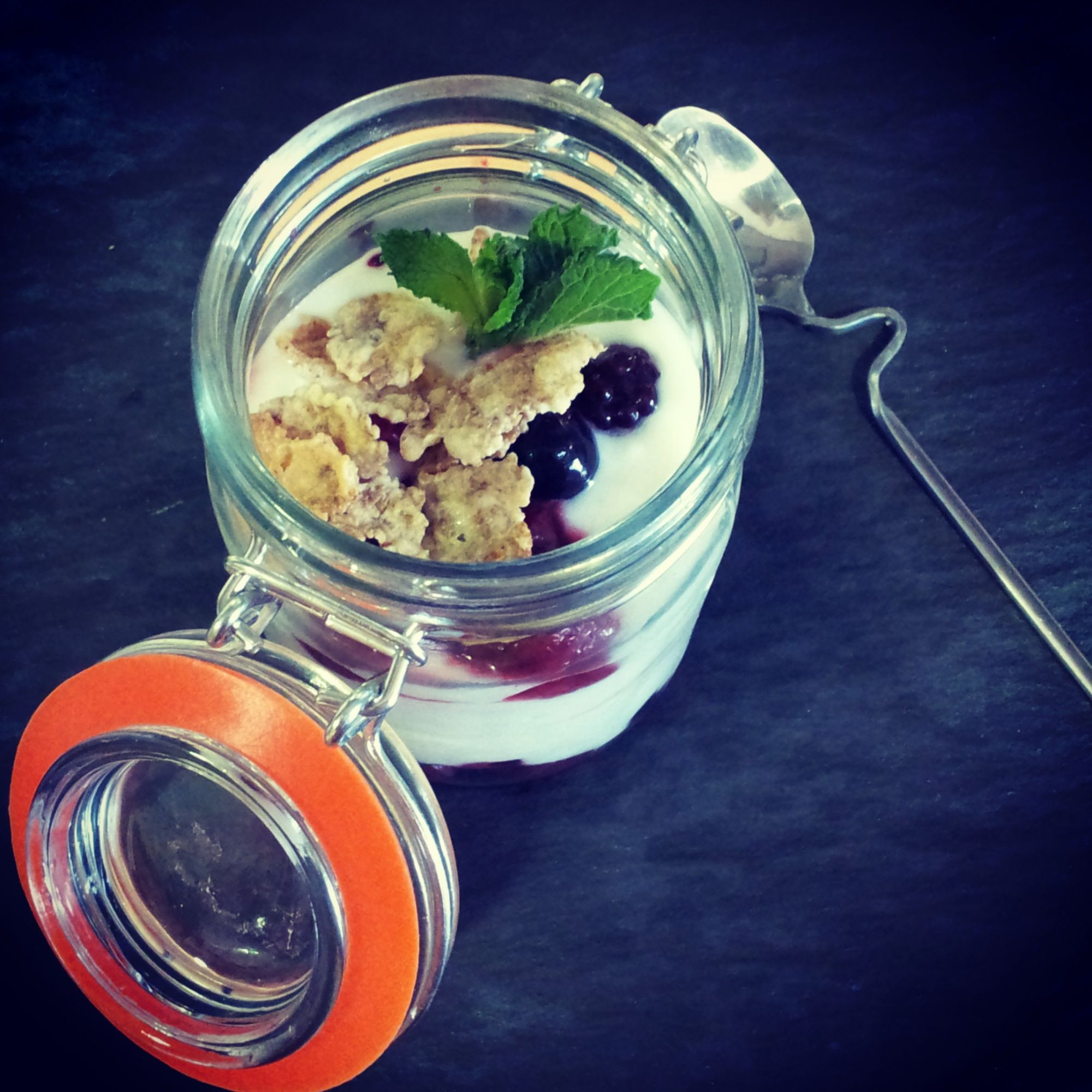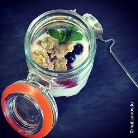 2. Espolvorear los frutos rojos de crispies y una ramita de hierbabuena (cerrar la conserva, enfriar 15 minutos para liberar los aromas de los ingredientes).
