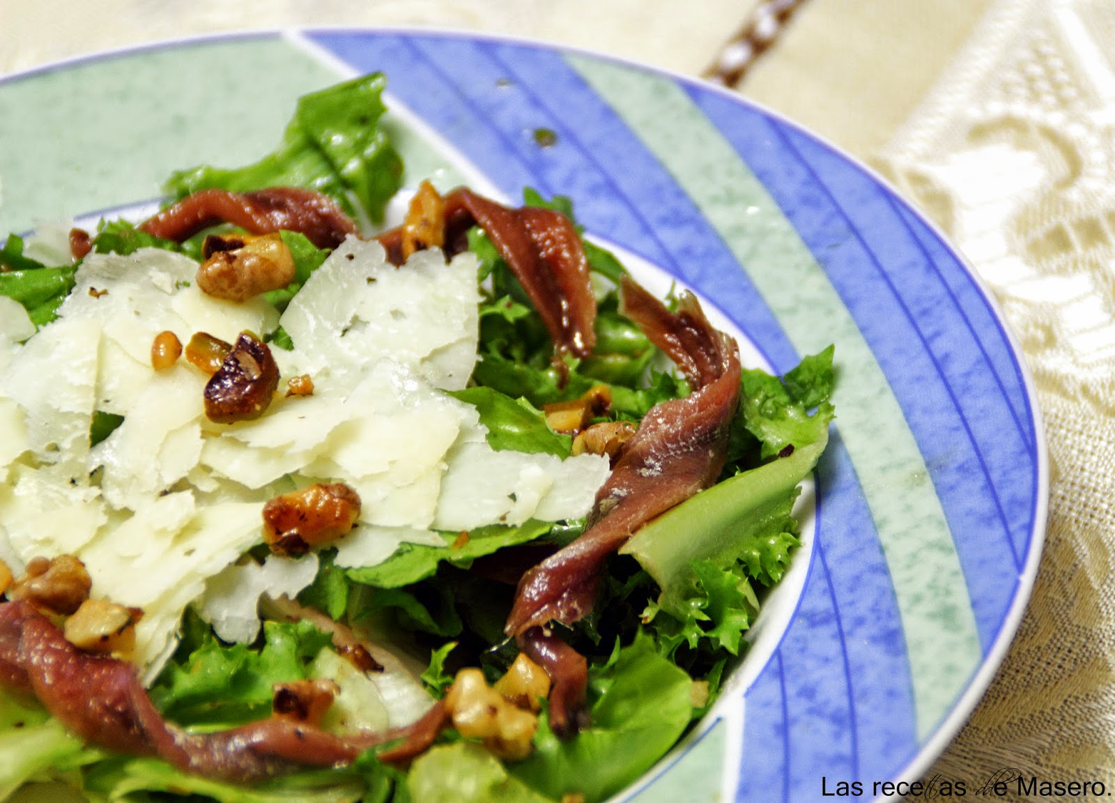 Después de tantas comidas familiares y excesos culinarios, hoy os traigo una ensalada riquísima de queso y anchoas con vinagreta de frutos secos para depurarnos un poquito. Para su elaboración, es importante que uséis un queso de calidad.