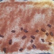 Abrimos la masa de hojaldre sin estirar y la untamos con mantequilla (esta opción de puede obviar) A continuación espolvoreamos con azúcar (en mi caso utilicé azúcar moreno). Y si les apetece, podemos hacer la mitad con trocitos de chocolate.