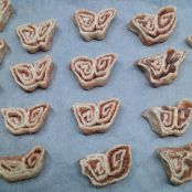 Cuando ya lo tenemos, vamos a girar la masa para que la parte de unión quede hacia abajo. Así es más fácil cortar las palmeritas.No se preocupen si se deforman, en el horno se hinchan y quedan perfectas. Cortamos y las vamos colocando en una bandeja de horno con papel adecuado para que no se nos peguen.