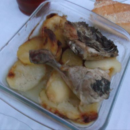 Destapamos, damos la vuelta a las patatas y colocamos el contramuslo cortado en dos trozos.