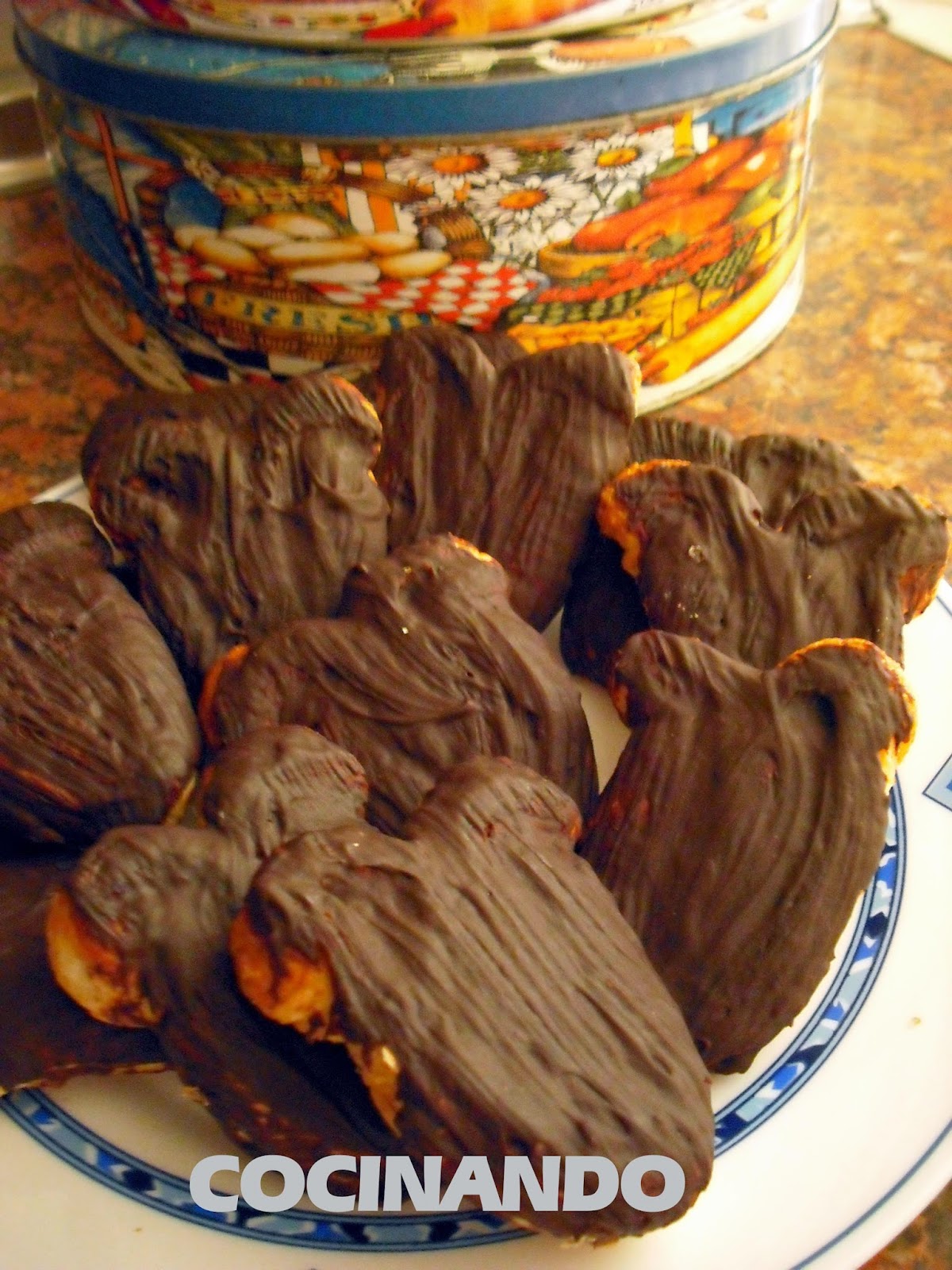 Mientras tanto fundiremos el chocolate con un poquito de leche, en el microondas. Cuando las palmeritas estén listas, las retiramos del horno y las pintamos con el chocolate fundido. Dejamos enfriar.
