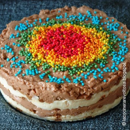 A continuación, toma una galleta, úntala con Nutella y añade 1 cdta de la crema. Cierra con otra galleta para formar un sándwich. Coloca cada uno de ellos al fondo de un molde para tartas. A continuación vierte una parte de la crema encima y forma otra capa de galletas. Cubre con el resto de la crema y refrigera. Al momento de servir, espolvorea con cacao en polvo o decora con nueces, lunetas o chispas de colores a tu gusto.