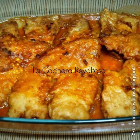 - En una fuente poner un poco de la salsa, las patatas, la merluza y el resto de la salsa.