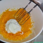 En un bol, batimos las yemas junto con el azúcar. Cuando veamos que ya están bien mezclados, uniremos el yogur y el aceite y continuamos batiendo.