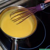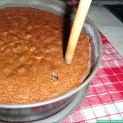 Lo sacamos y dejamos templar un poco. Estando aun templado, con el palo de una cuchara de madera, por ejemplo, hacemos una serie de agujeros (con cuidado de no llegar hasta el fondo) por todo el bizcocho. Dejamos enfriar mientras hacemos la crema.
