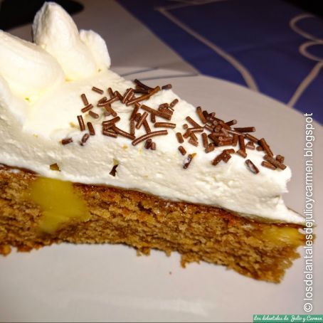Untamos el molde con mantequilla y enharinamos bien todo el interior y vertemos en el la mezcla del bizcocho. Lo llevamos al horno durante unos 45 minutos, o hasta que al pinchar con un cuchillo, este salga limpio.
