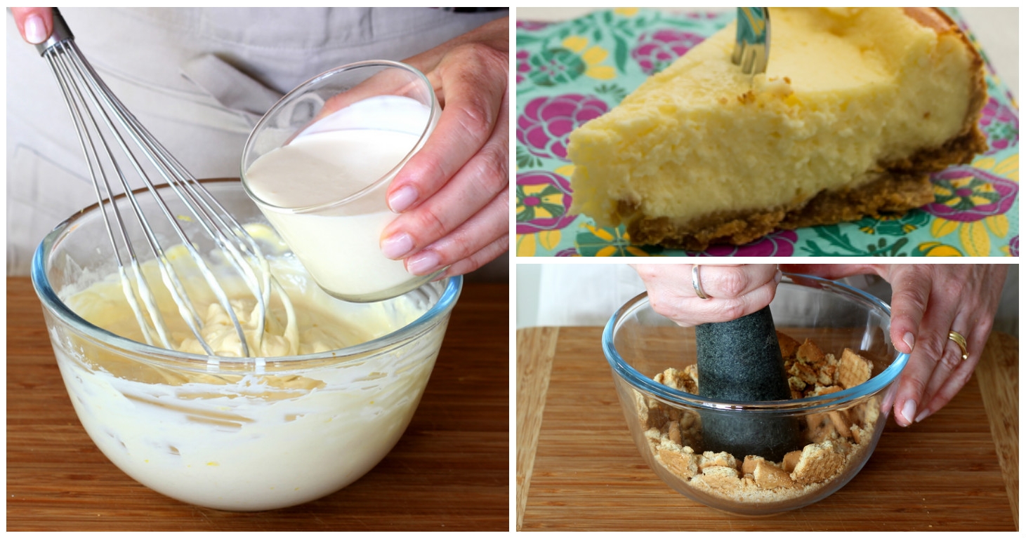 Se vierte la mezcla en el molde, sobre la base de galletas y se hornea con el horno ya precalentado durante unos 50 minutos, a 170 grados.