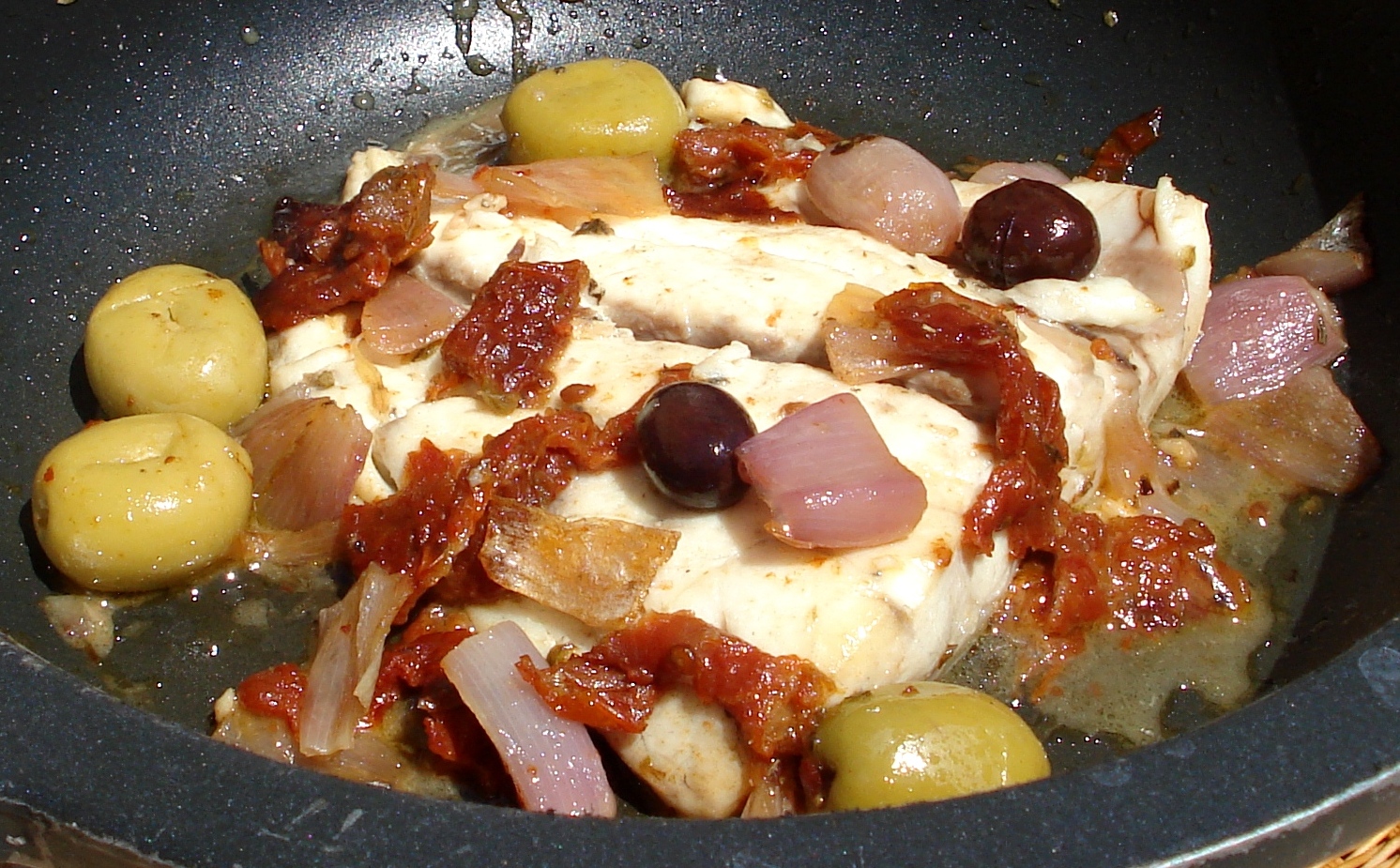 Cuando empiece a colorear la chalota, añadir las aceitunas y el orégano.