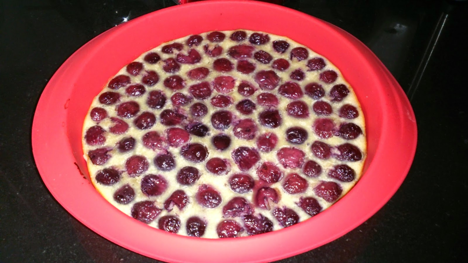 6. Volcamos esta masa en nuestro molde con cuidado para que no se muevan las cerezas. Probablemente algunas "floten" al poner la masa en el molde, y pensemos que nuestro esfuerzo de colocarlas bonitas no ha servido para nada pero ¡no os preocupéis! que durante el horneado vuelven a su sitio
