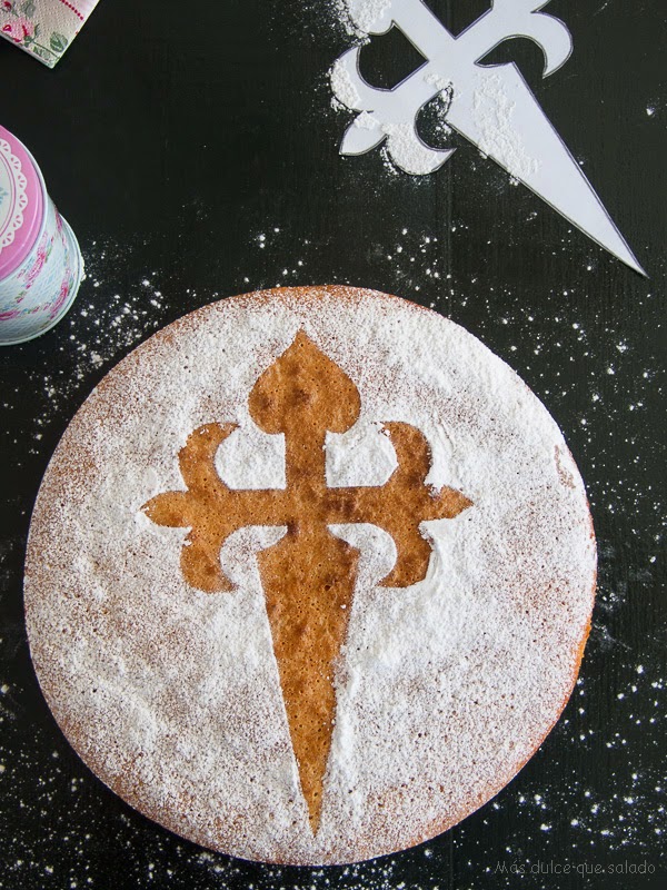 Una vez fría retirar el aro del molde, colocar la cruz de Santiago y espolvorear con azúcar glas toda la superficie. Retirar la cruz con mucho cuidado.