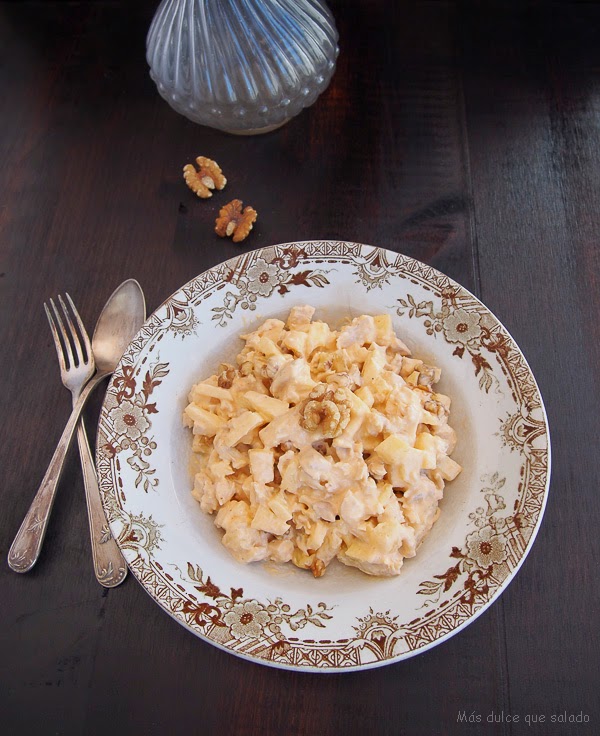 Pelamos y cortamos la manzana en dados. La piña la cortamos en trozos medianos. Las nueces las troceamos. Mezclamos con el pollo y añadimos la salsa cóctel rebajada con un poco del jugo que trae la piña. Mezclar para que se integre bien.