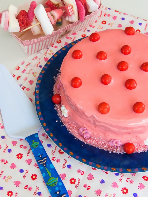 Colocar el primer bizcocho, untar una capa generosa de la crema de queso blanca, sin pasta de chicle. Colocar el otro bizcocho encima y cubrir los laterales y la parte de arriba con la crema rosa, la que lleva la pasta de chicle.