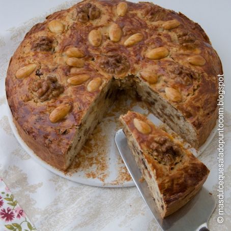 Engrasar un molde redondo de unos 23 cm de diámetro, volcar la masa. Decorar con las almendras y las nueces enteras y pincelar con la yema de huevo batida.
