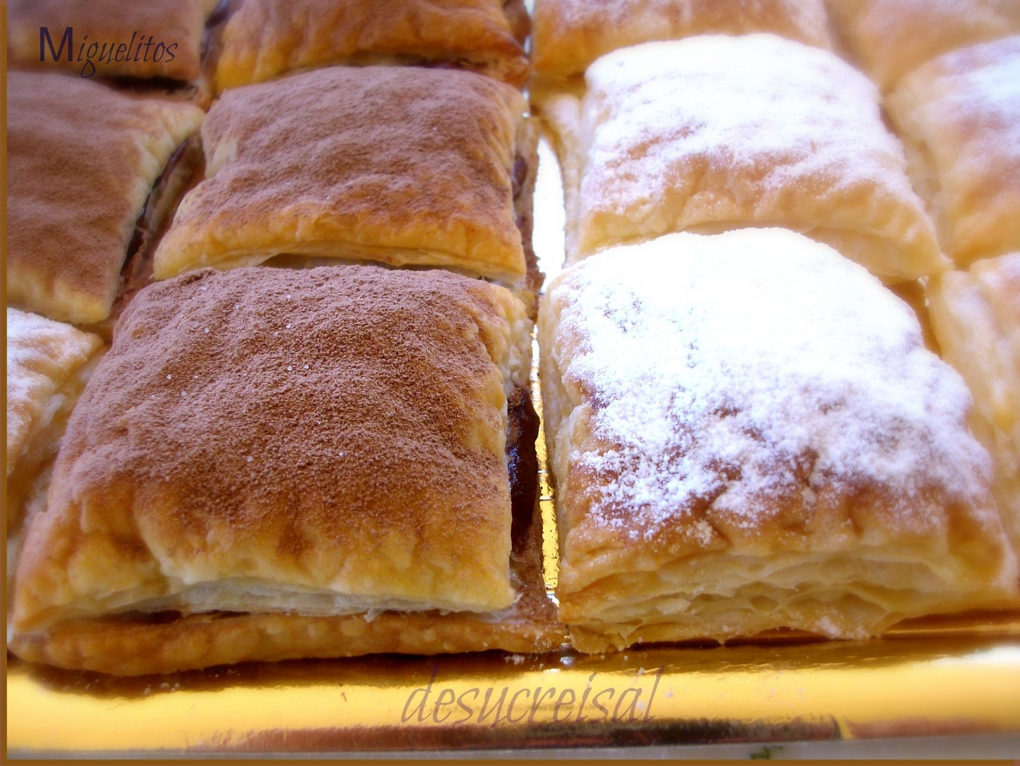 Una vez echa la crema,abrir los Miguelitos por el centro ayudándonos de la punta de un cuchillo,y rellenar la mitad de crema pastelera,y cuando los tengais,,,a la crema sobrante ,añadir una cucharada sopera de cacao puro valor,remover bien,y ya teneis la crema de chocolate echa,,y asì acabar de rellenar los miguelitos que falten.