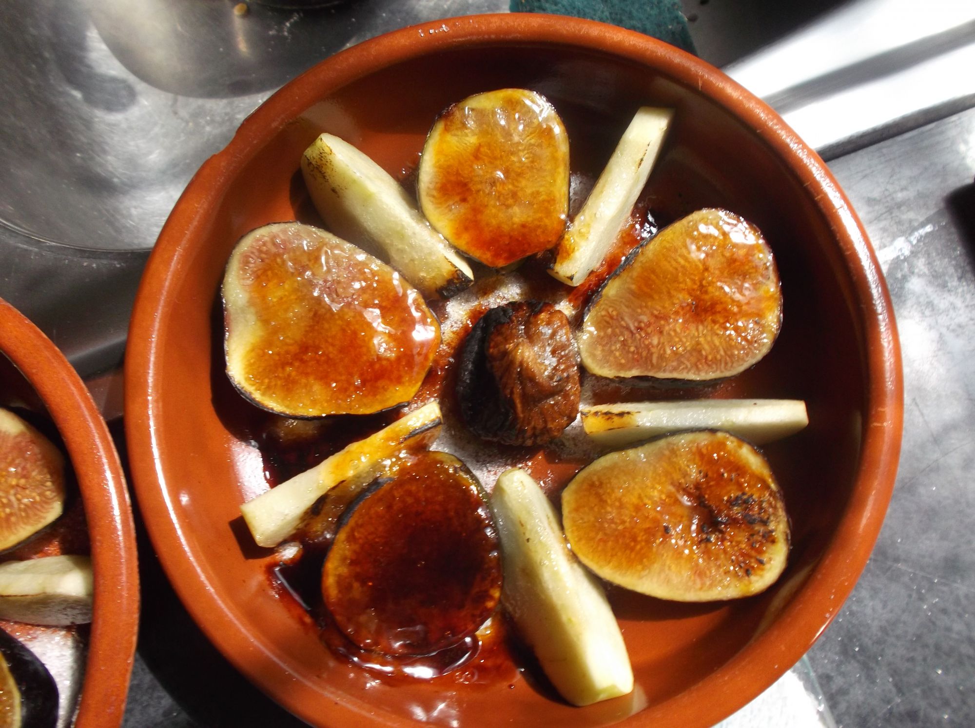 Colocamos la fruta alternada en una cazuelita de barro y en el centro colocamos un higo seco.