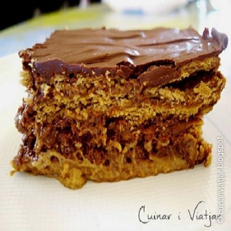 Hace algunas semanas preparamos esta receta para una comida familiar. Es muy fácil de preparar y no necesita horno. Únicamente se debe dejar en la nevera durante una hora antes de añadirle la cobertura de chocolate para que coja consistencia.