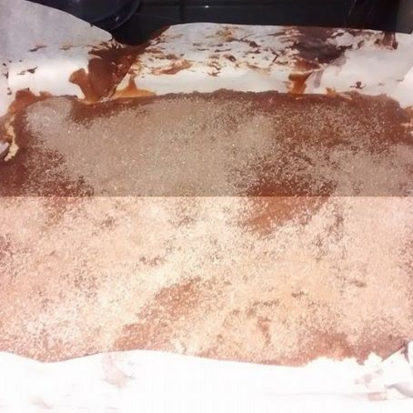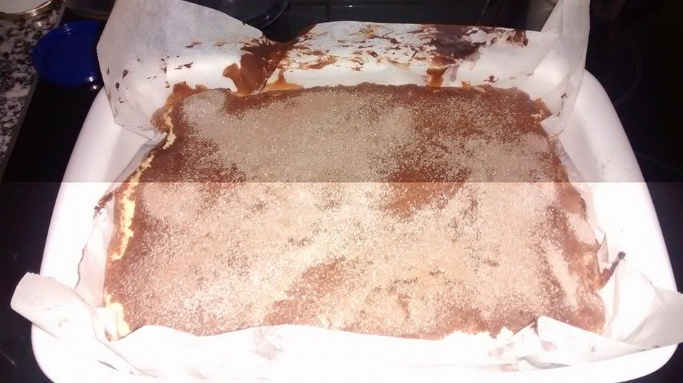 Vertemos el contenido en un molde rectangular cubierto de papel de horno, y espolvoreamos con una mezcla de canela y azucar toda la superficie.