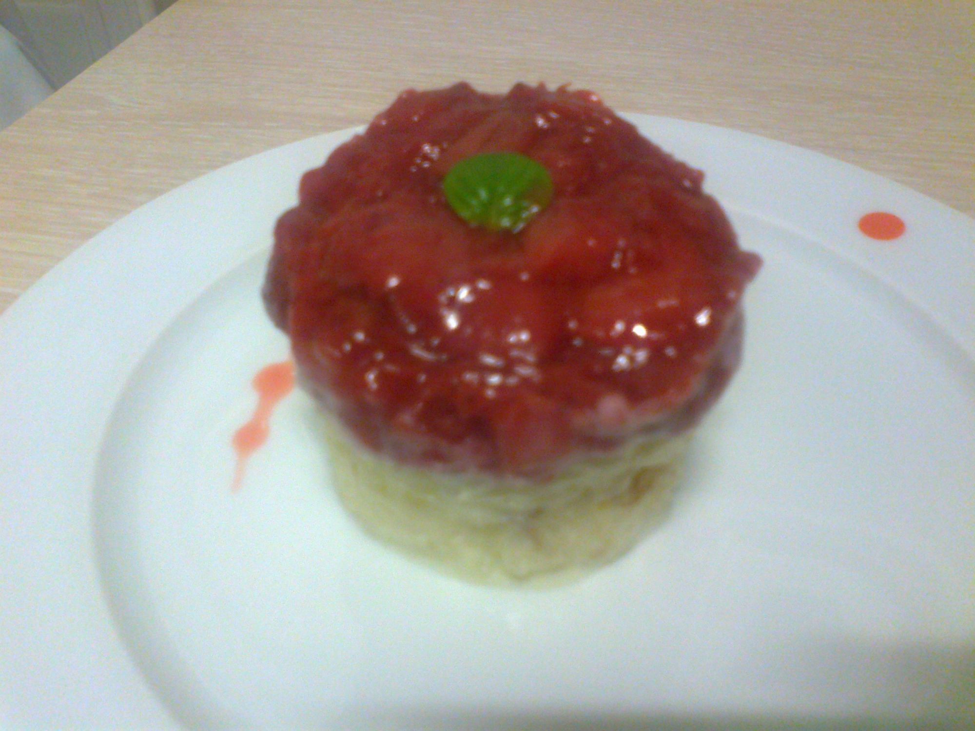 Arroz con leche muy cremoso con fresas en brunoise confitadas