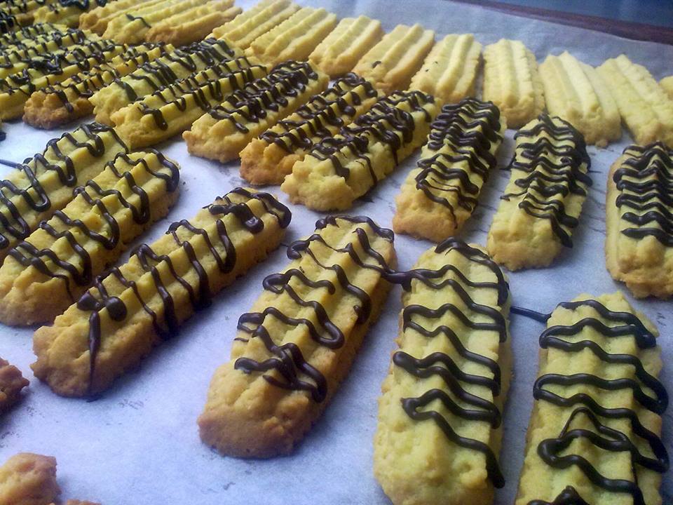 Dar forma a las galletas con ayuda de una manga pastelera y una boquilla del numero 12. Cuando tengamos todas las galletas puestas en la bandeja del horno, las hornearemos unos 10 minutos a 180°C (hasta que doren por los bordes)