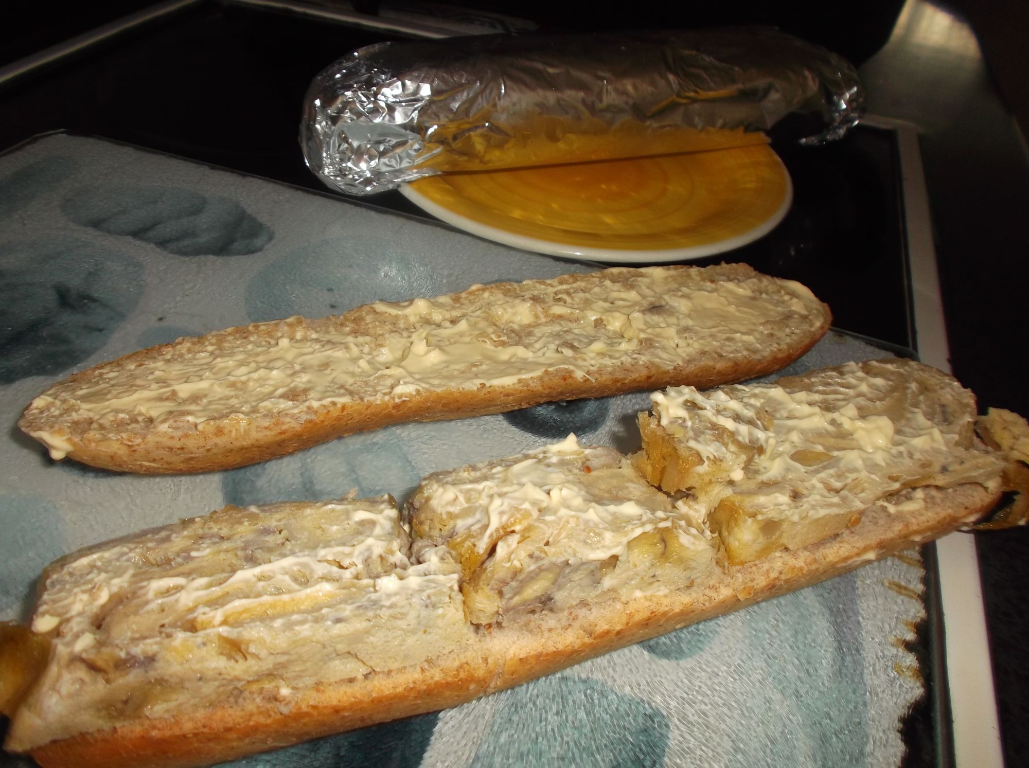 Untamos el pan de mayonesa, prefiero tomate y aceite, pero hay que gastar las sobras, además el pan integral es muy seco y le dará más jugosidad la mayonesa.