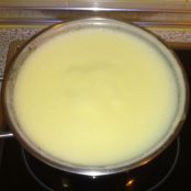 Mientras se calienta la leche en un bol grande mezclamos 1/2 de leche (Asturiana), los dos sobres de flan, las yemas que hemos separada antes y 6 cucharadas de azúcar. Cuando esté todo bien mezclado, lo echamos en el cazo de la leche (que esta ya caliente pero no cociendo) poco a poco y removemos constantemente. Subimos un poco el fuego y sin dejar de remover.