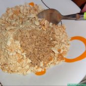 Lo primero que haremos será triturar, tanto las galletas como los cereales, pero procurando dejar trozos visibles, que no queden como polvo. Mezclamos los dos y los pondremos en el fondo de los recipientes donde presentaremos los postres (nosotros lo hicimos en vasos).