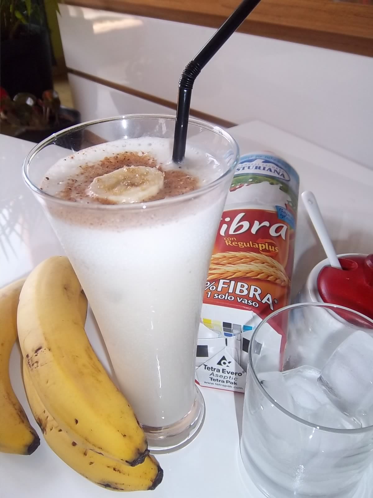 Servimos en un vaso alto, decoramos con canela en polvo, y con alguna rodajita de plátano.