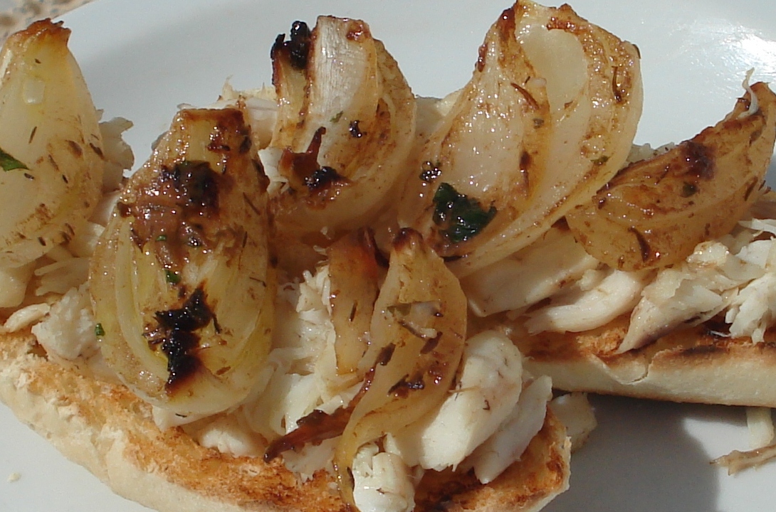 Como tenía unas sobras de pescado de la comida. Me he hecho unas tostadas cubiertas con el pescado desmenuzado, las cebollas y todo regado con la salsa de vinagre balsámico...me encantó.