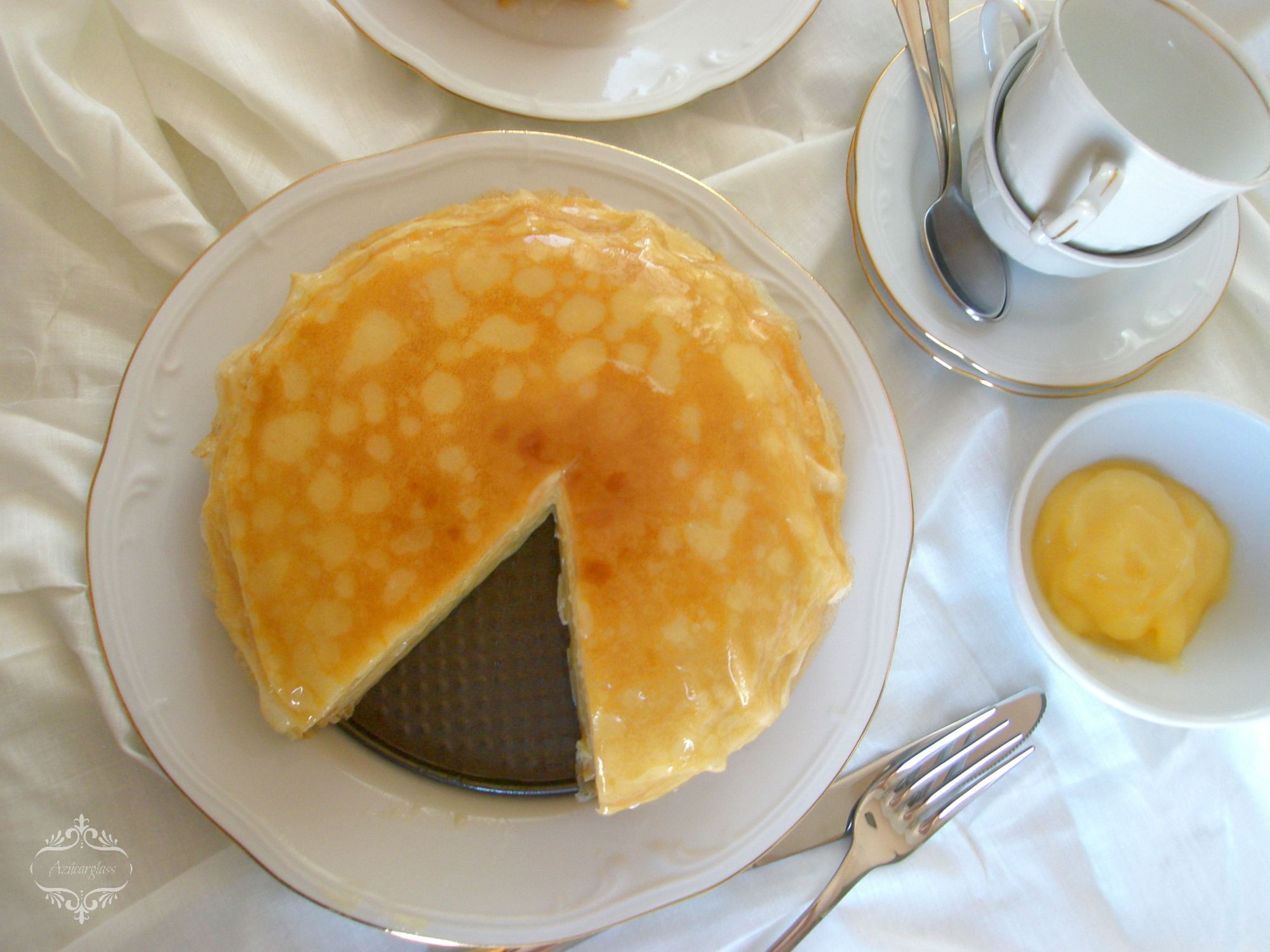 En un molde para tartas, alternar capas de crepes con una fina capa de crema pastelera, dejar un centímetro, más o menos, del borde de los crepes sin cubrir con crema pastelera para que no sobresalga.