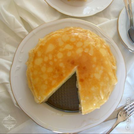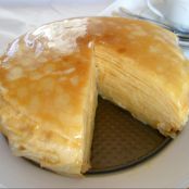 La tarta Mille crepês consiste en capas de crepes superpuestas rellenas de crema pastelera y en la capa superior lleva azúcar caramelizada.