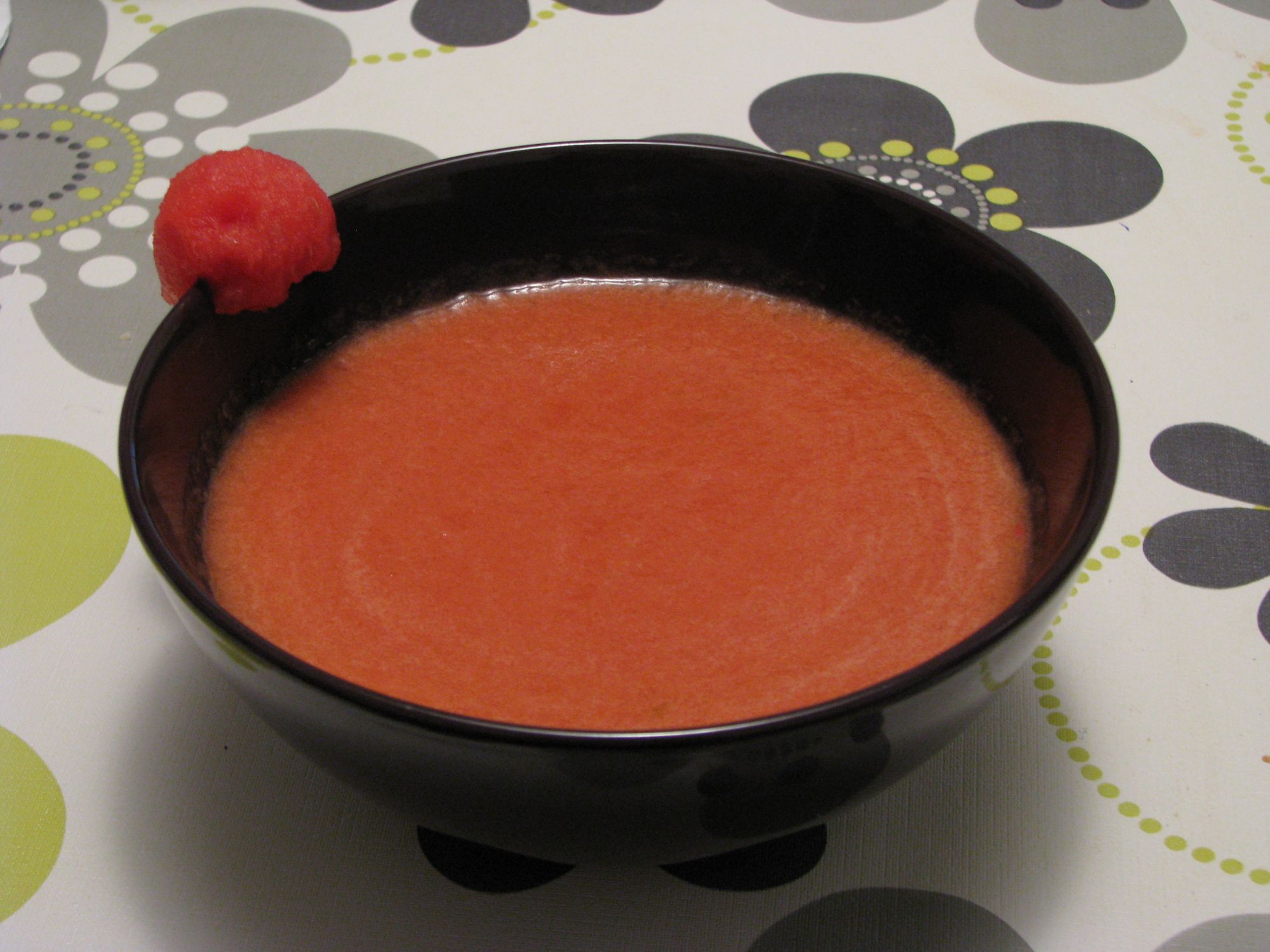 - Pela la sandía, córtala en varios trozos y échala en el vaso para batidora con el resto de los ingredientes, añade un poco de sal, aceite, vinagre y bate hasta que quede todo como una crema fina.