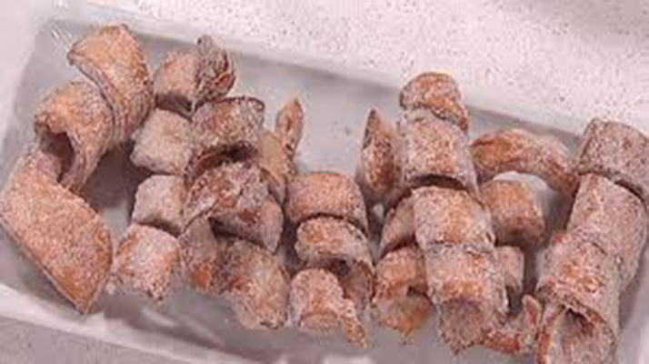 Una vez que tenemos todos los tirabuzones listos, los metemos en aceite abundante muy caliente, los sacamos a papel absorvente, les retiramos el palo, y los pasamos por una mezcla de harina y azúcar para terminarlos